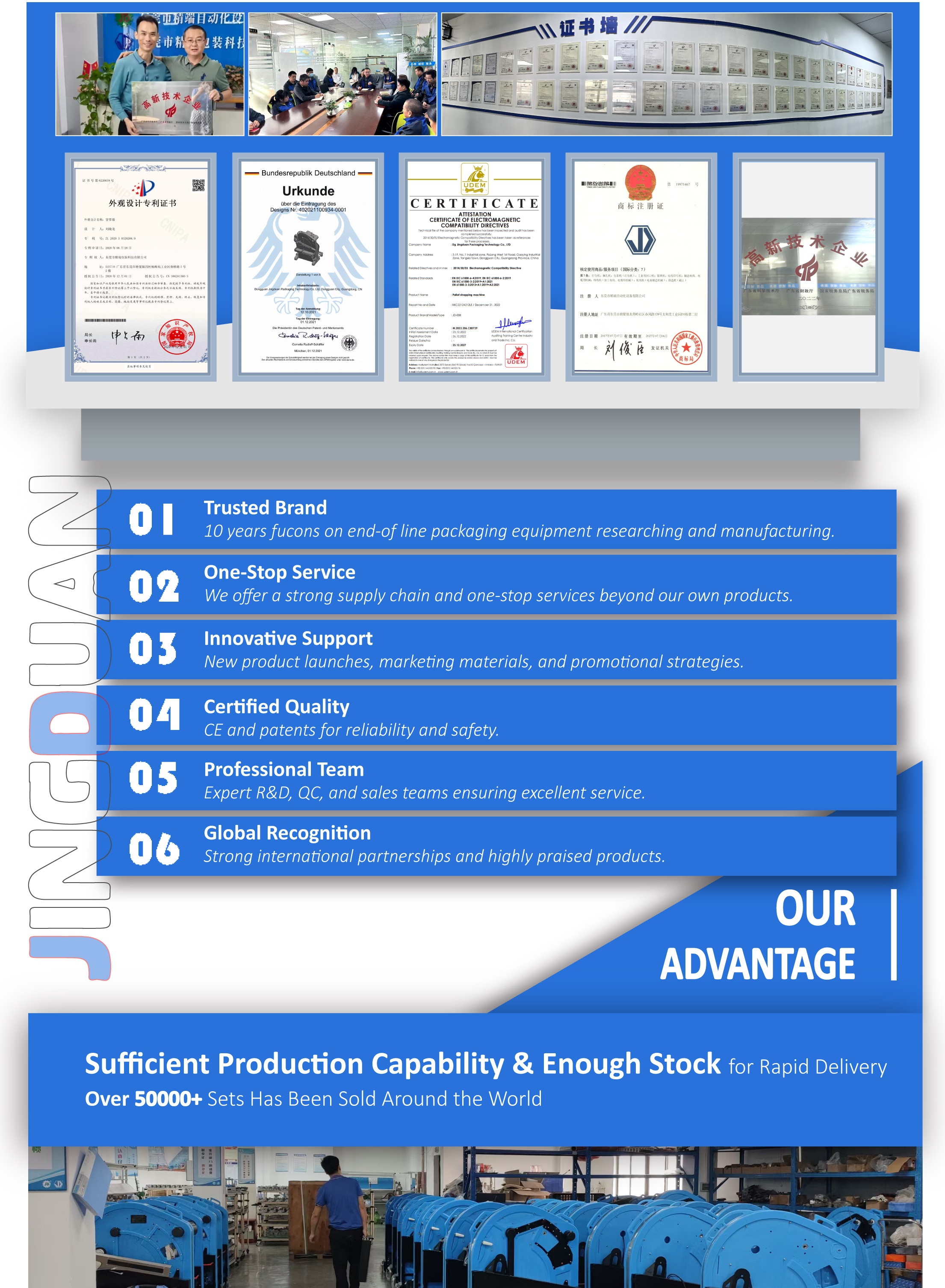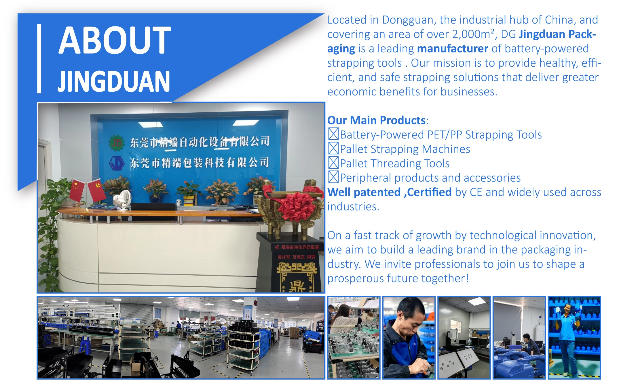 Founded in 2016 and covering over 2,000 m² in the industrial hub of Dongguan city, Dg Jingduan Packaging Technology Co., Ltd is a professional strapping tools and pallet strapping machines manufacturer. With over 10 years of experience in end-of-line packaging, we specialize in the production and sales of battery-powered strapping tools, pallet strapping machines, and pallet threading tools.