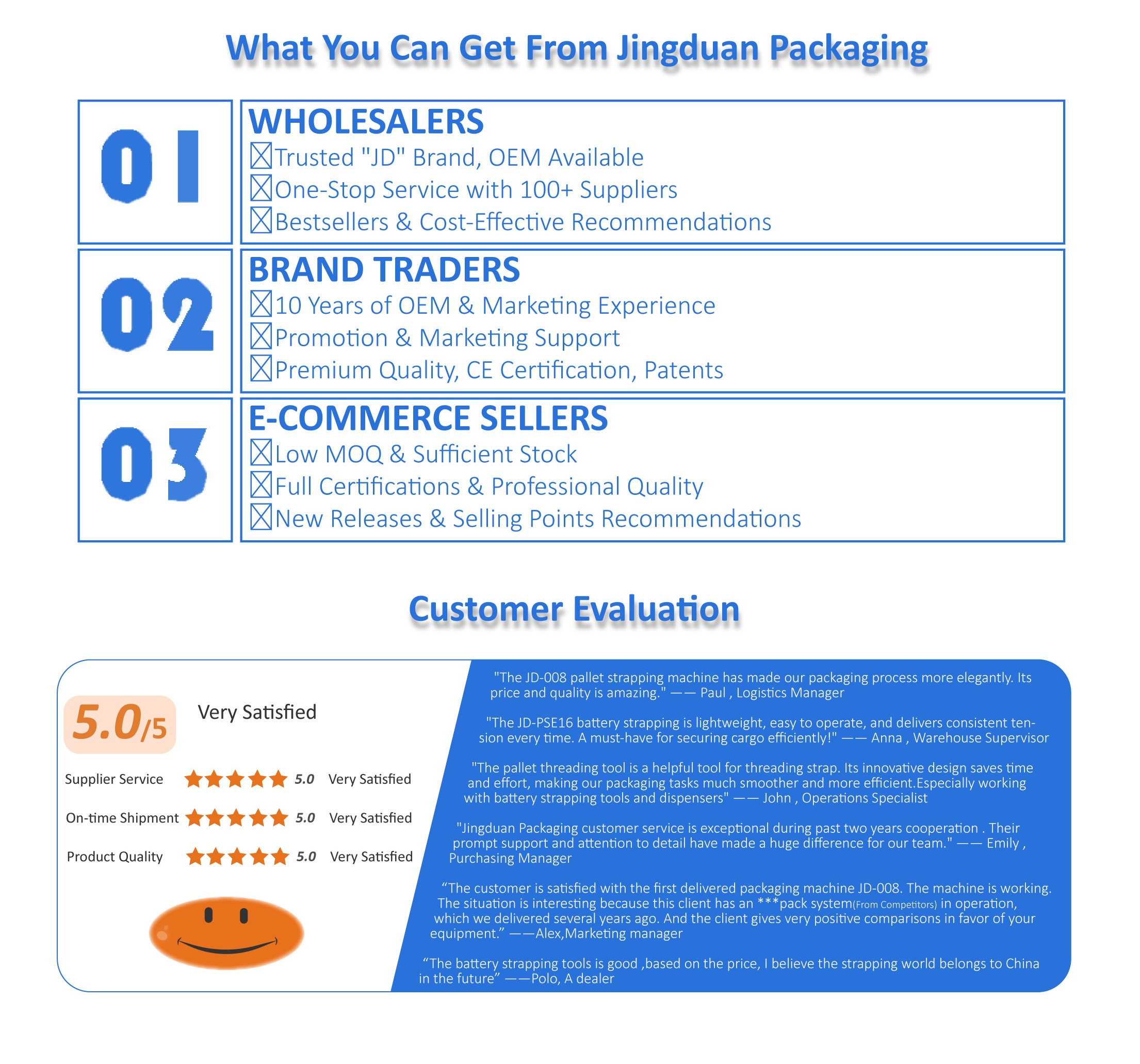 As we rapidly grow into a leading strapping tools and pallet strapping machines manufacturer, we welcome professionals, agents, and partners worldwide to join JD StrappingTool and create a prosperous future together.